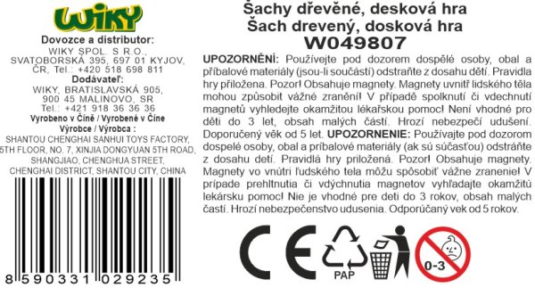 Šach drevený. Veľkosť šachovnice 29cm. Šachovnica má magnetické zatváranie aj figúrky. Každá figúrka má zospodu filc pre tichý pohyb po šachovnici. Figúrky je možné uložiť dovnútra do šachovnice.