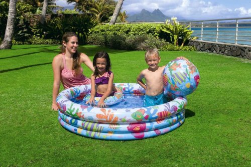 Bazénový set Ovocie obsahuje loptu, plávací kruh (51 cm) a bazén (132×28cm). Opravná záplata je priložená v balení.