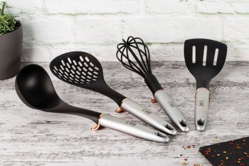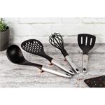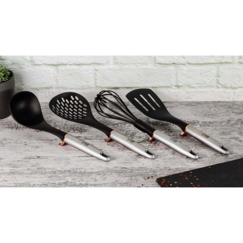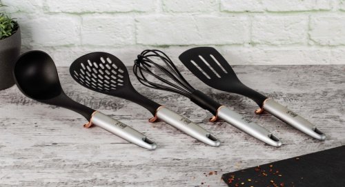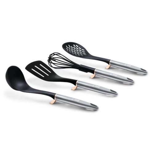Sada obsahuje štyri nenahraditeľné kúsky náčinia, ktoré uľahčia varenie, vyprážanie, miešanie aj servírovanie. Vďaka nylonovému prevedeniu sú maximálne šetrné k vášmu riadu a zároveň odolné voči vysokým teplotám. Praktická nožička zabraňuje dotyku s kuchynskou linkou, takže si udržíte pracovnú plochu čistú aj počas varenia.