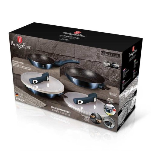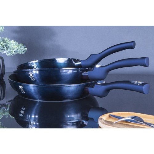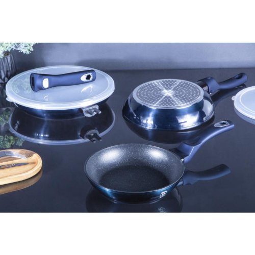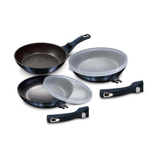Multifunkčná sada panvíc BerlingerHaus z kolekcie Aquamarine Metallic Line zaujme nielen krásnym metalickým dizajnom, ale predovšetkým špičkovými funkčnými vlastnosťami . Vďaka 3-vrstvovému nepriľnavému mramorovému povrchu sa potraviny nepripaľujú a panvice sa ľahko čistia. Dve panvice navyše disponujú odnímateľnou rukoväťou , takže ich môžete bez obáv použiť aj na zapekanie v rúre do 220 °C.