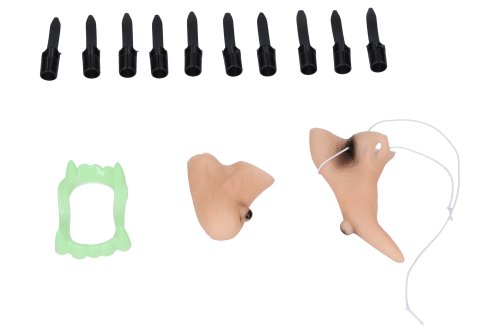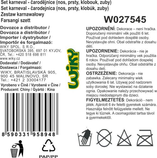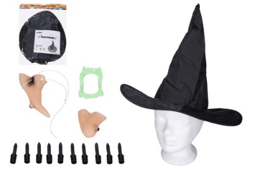Set pre každú správnu čarodejnicu Set obsahuje: bradu na gumičke, nos na gumičke, 10 nasadzovacích prstov s nechtami, zuby a veľký čarodejnícky klobúk