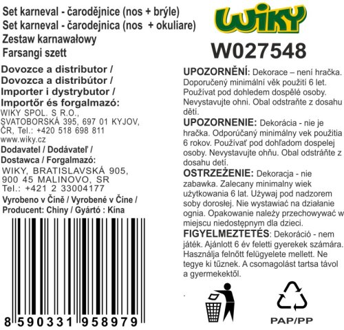 Karnevalový set - čarodejnica Obsahuje: nos, okuliare Pokiaľ sa chystáte na párty alebo halloweensku oslavu tento set nesmie chýbať ako doplnok k Vášmu kostýmu. Rozmery balenia 17 x 18 x 2 cm.