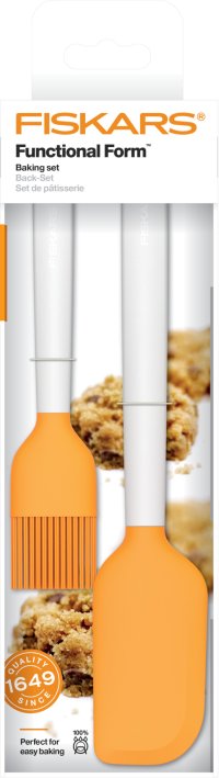 Súprava na pečenie Fiskars Functional Form zložená zo stierky na cesto a mašlovačky je zabalená v darčekovej krabičke. Stierka na cesto Fiskars Functional Form má silikónovú pracovnú časť, asymetrický tvar vám umožní dosiahnuť do všetkých záhybov riadu.