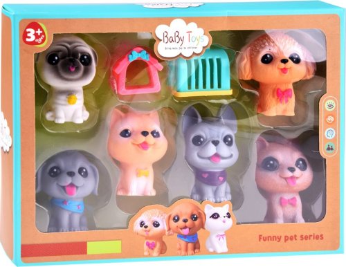 Rozkošné figúrky psíkov sú ideálne pre detské ručičky a dajú sa ľahko uchopiť. Ich milé tváre a veľké oči vás presvedčia na prvý pohľad. Po stlačení vydávajú smiešny zvuk, rovnako ako naozajstné šteniatka. Vyrobené z mäkkej gumy. Obsah balenia: 4 figúrky psíkov, búdka, prepravka. Rozmery figúrok (rozmery sa môžu mierne líšiť v závislosti od typu figúrky): cca. 8 x 4 x 6 cm Poznámka: Fotografie sú iba ilustratívne. Farebné prevedenie sa môže mierne líšiť od vyobrazených fotografií.