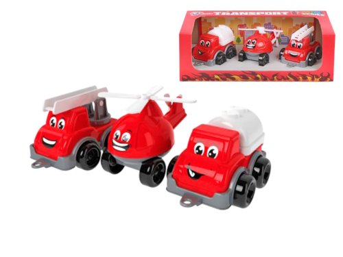 Súprava troch kusov hasičských vozidiel v detskom dizajne s očami. Autá sú plastové a meria 11 cm. Deti si s nimi užijú množstvo zábavy.