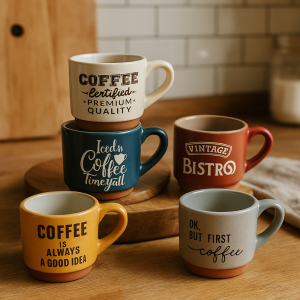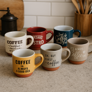 Sada 6 kameninových hrnčekov s rôznymi kávovými motívmi.