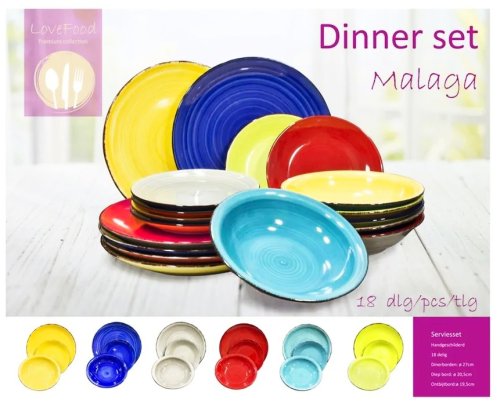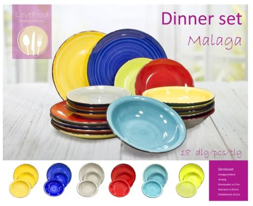 Vneste leto do svojho domova s touto 18-dielnou sadou riadu model ´Malaga´. Táto sada je vhodná pre 6 osôb. Sada sa skladá z: 6x jedálenský tanier 27 cm 6x hlboký tanier 20,5 cm 6x raňajkový tanier 19,5 cm. Riad je vhodný do umývačky.