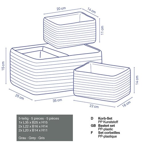 Sada obsahuje: - 2x kôš 20 x 14 x 11 cm - 2x kôš 22 x 16 x 14 cm - 1x kôš 35 x 25 x 15 cm - materiál: PP plast - vnútro: podšívka - farba: čierna - značka: KELA