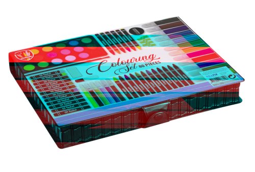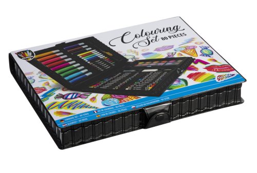 Sada na kreslenie obsahuje 12 hrubých fixiek, 6 tenkých fixiek, 18 voskoviek, 12 olejových pastelov, vodovky v 18 odtieňoch, pravítko, strúhadlo, guma a ďalšie doplnky. Rozmer balenia cca 28 x 22 x 4 cm. Vek 3+