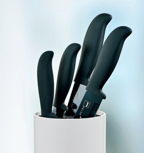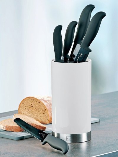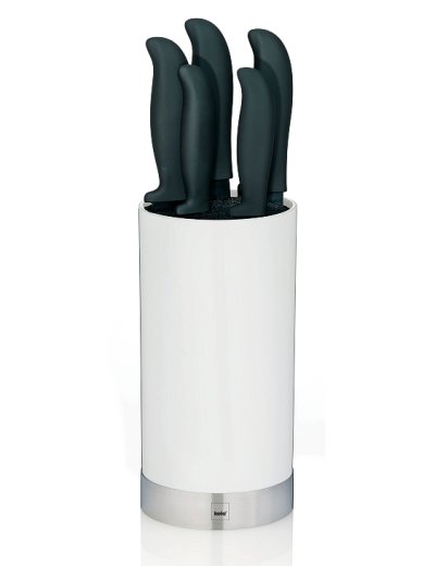 Vysoko kvalitné nože z ocele v čiernej farbe v stojane z PP plastu bielej farby. Praktické vnútro je tvorené tenkými plastovými tyčami, ktoré umožňujú ľubovoľné umiestnenie nožov a zabraňujú poškriabaniu ostria. cm, priemer 11 cm)- značka: KELA