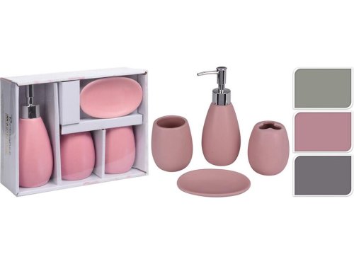 Jemná a elegantná sada voľne stojacich kúpeľňových doplnkov v pastelových farbách je vhodná do každej kúpeľne.