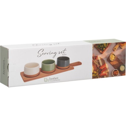 Prineste do svojho stolovania štýl aj harmóniu. Táto servírovacia sada obsahuje tri kameninové misky v zemitých farbách usadené na tmavej bambusovej doske. Skvelá voľba na servírovanie predjedál, dipov, orieškov alebo malých pochutín pri každej príležitosti.