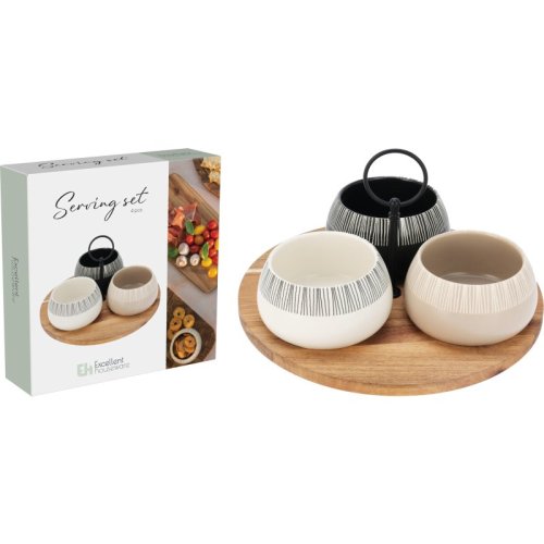 Dodajte svojmu stolu výnimočný vzhľad. Táto servírovacia sada v sebe spája prírodnú eleganciu akáciového dreva, nadčasový vzhľad kameninových misiek a industriálny akcent vďaka kovovej rukoväti v matnej čiernej farbe. Skvelé na servírovanie pochutín, dipov či dezertov.
