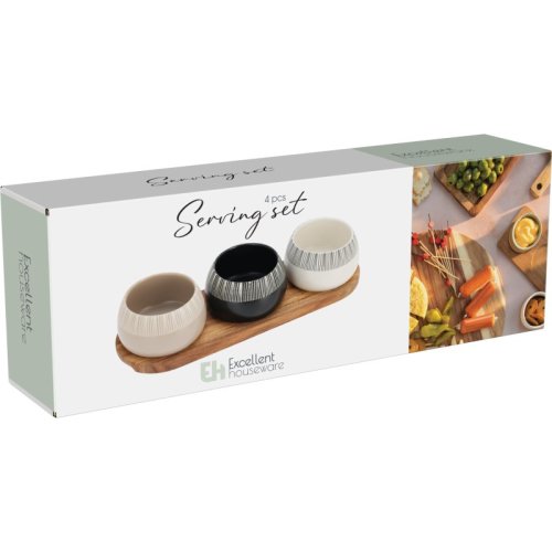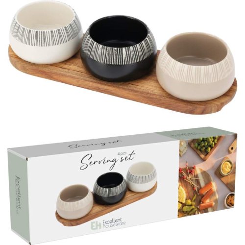 Vychutnajte si servírovanie s vkusom. Táto štýlová sada kombinuje rustikálnu doštičku z akáciového dreva a tri kameninové misky s jemným prúžkovaným vzorom. Ideálne na podávanie drobného občerstvenia, omáčok, orieškov či tapas.