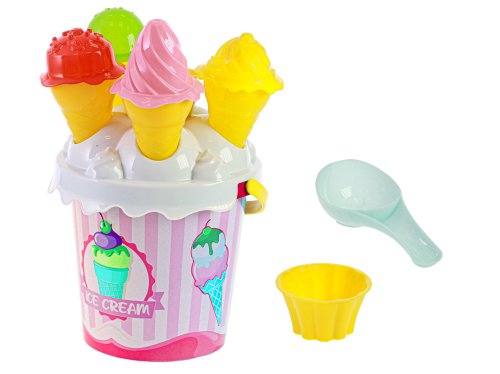 Detská sada na hranie na pieskovisko, na záhradu alebo do vody v podobe cukrárne. Obsahuje vedierko, 4 kornútky, 4 farebné čiapočky v tvare zmrzliny, naberačku a bábovičku v tvare malého téglika.