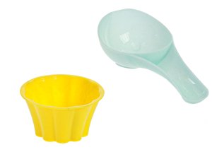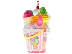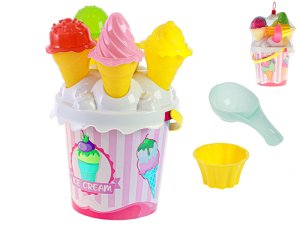 Detská sada na hranie na pieskovisko, na záhradu alebo do vody v podobe cukrárne. Obsahuje vedierko, 4 kornútky, 4 farebné čiapočky v tvare zmrzliny, naberačku a bábovičku v tvare malého téglika.