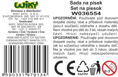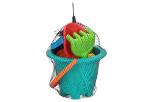 Súprava na piesok. Rozmery 18x15x20 cm. Súčasťou vedierko, kanvička, lopatka, hrable, 3 formičky.
