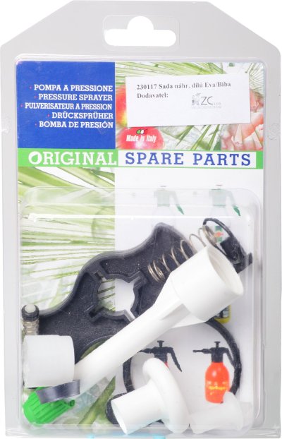 Sada náhradných dielov k postrekovačom Biba a Eva, obsahuje postrekovacie hubicu s tryskou, tesnenie piestu, pružinu spúšťacieho ventilu a kľúč k výmene trysky.