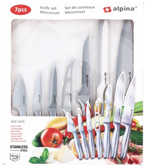 Hľadáte sadu nožov na všetky možné účely? Táto sada nožov alpina obsahuje 7 rôznych nožov, vrátane kuchárskeho noža, noža na mäso, noža na syr a krájacieho noža. Takže s tým môžete ísť oboma smermi. Nože sú všetky vyrobené z nerezovej ocele, takže ich možno bez poškodenia vložiť do umývačky riadu. Technické údaje Sada nožov alpina Obsah: Kuchársky nôž: 34,5 cm Rezbársky nôž: 34 CM Rezbársky nôž: 29,5 cm 22 cmNôž na krájanie: 20 cmNôž na mäkký syr: 19 cmMateriál: nerezová oceľZnačka: Alpina