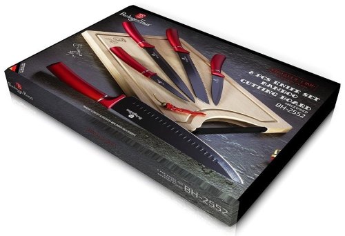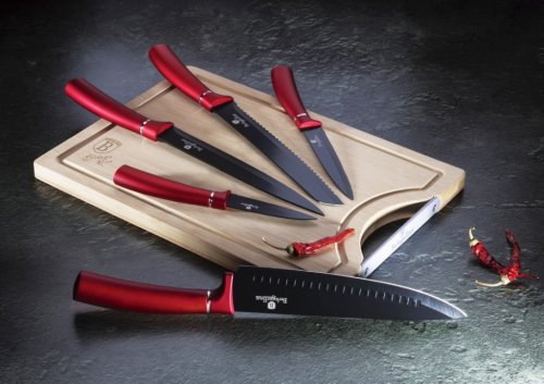 Sada nožov s nepriľnavým povrchom + doštička 6 ks Burgundy Line je výbornou alternatívou pre kuchárov rôznych úrovní, na ktorej výrobu bol použitý kvalitný materiál: nerez oceľ s nepriľnavým povrchom, vynikajú perfektnou ostrosťou čepele a dizajnom . Veľmi oceníte aj ergonomicky tvarovanú rukoväť , vďaka ktorej sa vám nože budú skvele držať. Celá sada je dielom výrobcu BERLINGERHAUS, ktorá sa výrobe nožov venuje pomerne dlho a sú riadne odskúšané.
