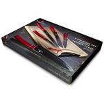 Prakticky vybavená sada nožov z kolekcie Burgundy Metallic. V sade nájdete 5 najpoužívanejších kuchynských nožov a navyše veľkú bambusovú doštičku s logom značky. Nerezové nože sú potiahnuté nepriľnavým antibakteriálnym povrchom, ktorý je šetrný k potravinám, navyše sa pri krájaní na nože nič nelepí. Ergonomicky tvarovaná rukoväť má na dotyk mäkčený povrch, ktorý je protišmykový, nôž sa v ruke veľmi pohodlne drží a nešmýka. Doštička z bambusového dreva s drážkou na odtekanie štiav možno pohodlne vziať za rukoväť a krájané potraviny premiestniť rovno do hrnca.