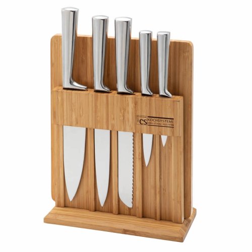 • drevený stojan s piatimi nerezovými nožmi a doskou - celonerezové prevedenie z jedného kusu ocele - laserom brúsená čepeľ pre dlhotrvajúce maximálne ostrosť - precízne spracovanie tradičnej nemeckej nožiarskej značky CS Solingensilné odolné nože s dlhou životnosťou - nože majú ergonomicky tvarované rukoväte s pevným ochranou prstov - sada 7 ks obsahuje, (dĺžky čepelí): - šéfkuchársky nôž 20 cm - porcovací nôž 20 cm - nôž na pečivo 20 cm - univerzálny nôž 13 cm - kuchynský nôž 9 cm - drevená doštička zasadené v stojane - drevený
