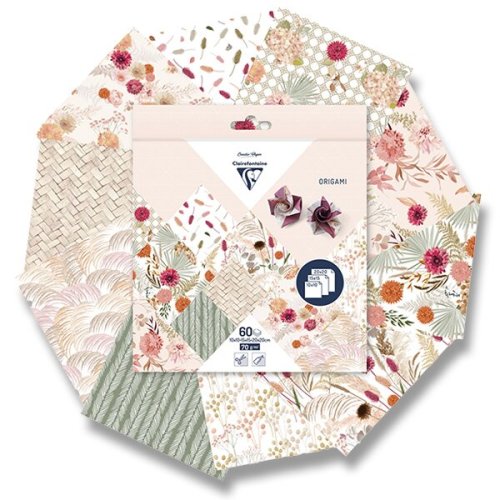 Sada papierov Clairefontaine Origami. Origami je známe japonské umenie skladania papiera. Zábavné a prístupné všetkým, od začiatočníkov až po pokročilých tvorcov. Jednotlivé listy sú so vzorom na prednej strane a hladké na zadnej strane. Balenie obsahuje 60 listov s motívmi suchých kvetov. Gramáž 70 g Balenie obsahuje mix veľkostí: 10 x 10 cm, 15 x 15 cm a 20 x 20 cm.