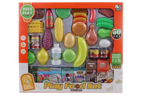 Veľká sada potravín. V balení nájdete potraviny ako napr. ovocie, zeleninu, hranolky, plechovky s mäsom alebo kartóny s mliekom a džúsom. Celkom 50ks v balení. Materiál plast. Rozmery balenia 33,5x29x4 cm. Vek 3+