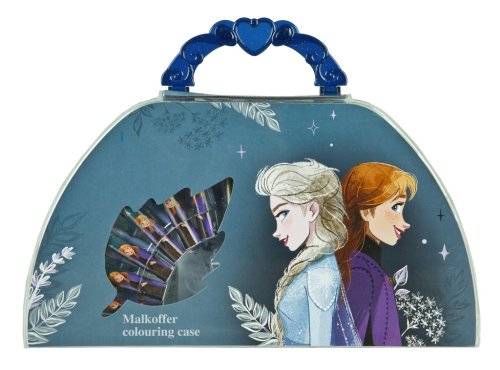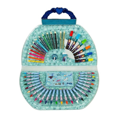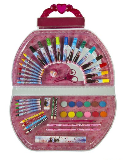 Sada potrieb do školy v kufríku s uškom obsahuje: 6 mini pasteliek, 12 fixiek, 12 voskoviek, 12 vodových farieb so štetcom a paletou, guma, 2 ceruzky, strúhadlo, pravítko a nožnice.