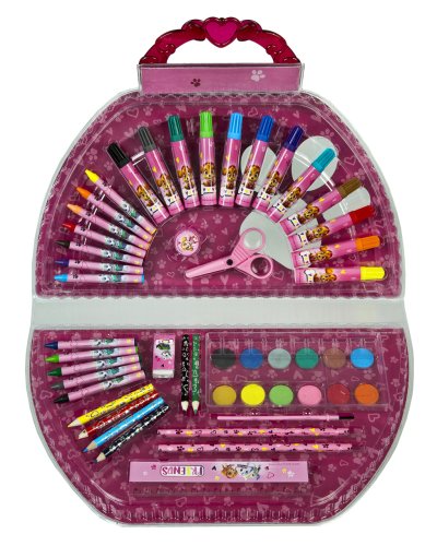 Sada potrieb do školy v kufríku s uškom obsahuje: 6 mini pasteliek, 12 fixiek, 12 voskoviek, 12 vodových farieb so štetcom a paletou, guma, 2 ceruzky, strúhadlo, pravítko a nožnice.