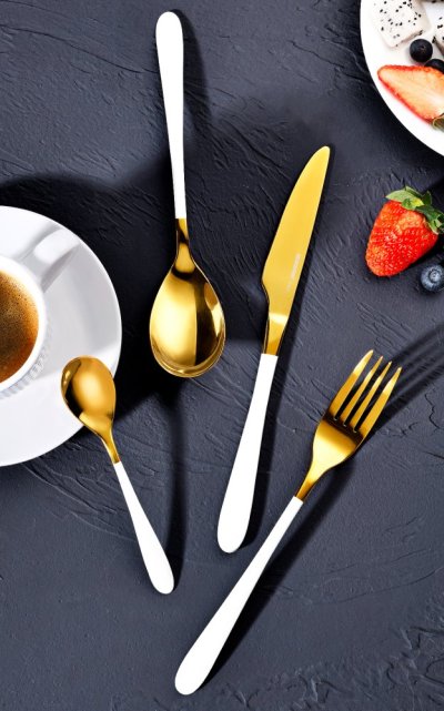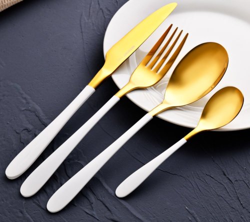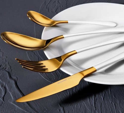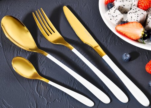 • Nerezové príbory. Bergner, biela kolekcia Lisboa 16 nerezových príborov, zaručujúca veľkú odolnosť a dlhú životnosť príborov. •Kompletné a moderné príbory. Skladá sa zo 4 lyžíc, 4 nožov, 4 vidličiek a 4 čajových lyžičiek. Celkom 16 jedálenských súprav vyrobených z nerezovej ocele. •Elegantný dizajn. Je ideálny pre zvláštne príležitosti, jedlo alebo zvláštnu udalosť na oslavu s blízkymi. Prináša na stôl dotyk odlišnosti a dobrého vkusu. • Ponúka moderný dotyk. Sada príborov je zlatá s matne bielou rukoväťou. Majú moderný, lesklý povrch a iný, elegantný štýl. •Praktický. Tieto nerezové príbory ponúkajú vynikajúce vlastnosti. Sú ľahko umývateľné a vhodné do umývačky. Zachovávajú si odolnosť a vzhľad . Vyrobené z vysoko kvalitnej odolnej nerezovej ocele s lesklým zlatým PVD povrchom a červeno lakovanou rukoväťou. Sada príborov, ktorá je nielen mimoriadne funkčná, ale aj oblečie váš stôl eleganciou bielej. Jednoduché čistenie, odporúčame ručné čistenie na predĺženie životnosti produktu.