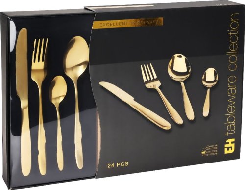 Luxusná sada príborov z nerezovej ocele so zlatým PVD povlakom a zrkadlovo lešteným povrchom. Ideálne pre elegantné stolovanie a špeciálne príležitosti.