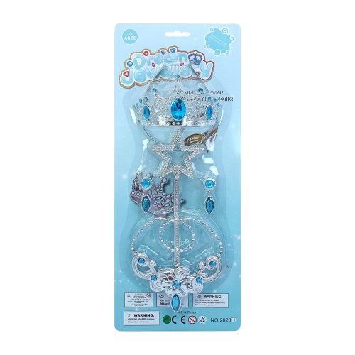 Premeňte sa na očarujúce princeznú! Táto nádherná detská sada obsahuje všetko, čo malá kráľovská duša potrebuje na svoju premenu – striebornú korunku, kúzelnú paličku, elegantný náhrdelník a trblietavé náušnice. Niektoré kúsky sú zdobené žiarivými modrými kamienkami, ktoré dodávajú celej sade rozprávkový vzhľad. Ideálne na karneval, narodeninovú oslavu, hranie na princeznú alebo len tak pre radosť.