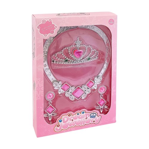 Elegantná sada doplnkov, ktorá premení každú malú slečnu na rozprávkovú princeznú! Súprava obsahuje korunku, náhrdelník a náušnice v striebornej farbe, zdobené žiarivými ružovými kamienkami.