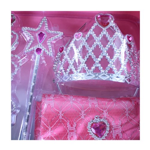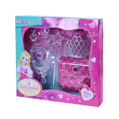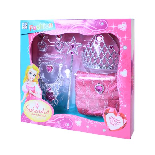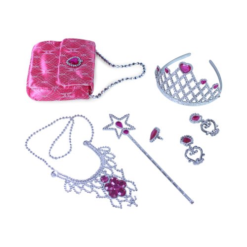 Exkluzívna sada pre všetky malé princezné! Krásna korunka s náušnicami, náhrdelníkom, paličkou a kabelkou. Doplnky sú zdobené ružovými prvkami. Perfektná sada ku kostýmu! Odporúčané pre dievčatá od 3 rokov.