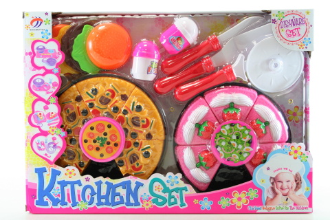 Plastová sada obsahuje koláč a tortu na dieliky, hamburger, soľničky, koreninu a náčinie. Rozmer koláča cca 16 cm. Rozmer balenia cca 40 x 28,5 cm. Vek 3+
