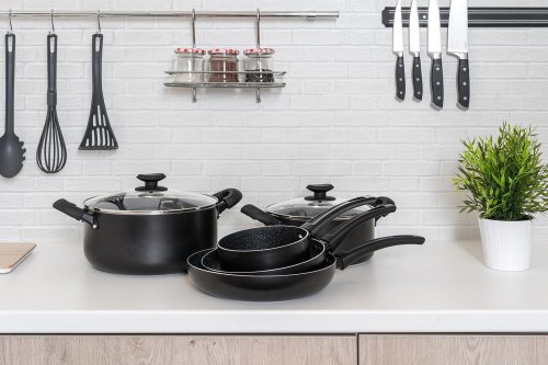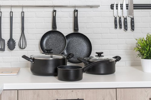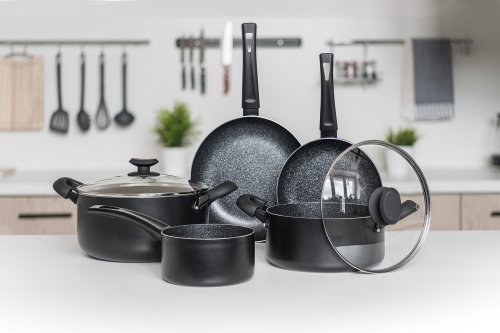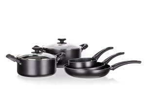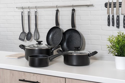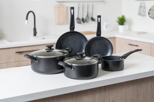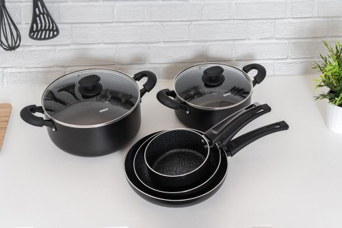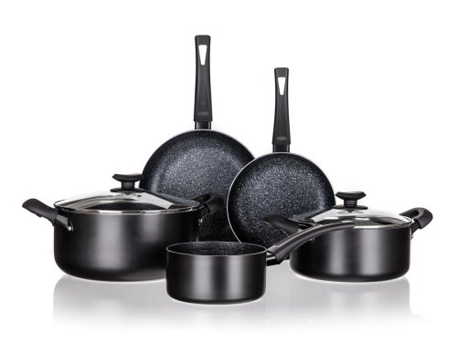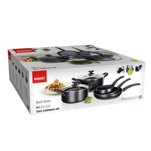 Súprava hliníkového liateho riadu BLACK STONE 7 ks, obsahuje: rajnicu 16 cm, hrniec 20 cm so sklenenou pokrievkou, hrniec 26 cm so sklenenou pokrievkou, panvicu 20 cm a panvicu 26 cm. Všetko má plne indukčné dno, bakelitové rukoväte so soft touch povrchovou úpravou. Nepriľnavý povrch je veľmi tvrdý a odolný proti poškriabaniu. Výrobky v sade sú odolné proti nárazu a deformácii tvaru. Vysoká tepelná vodivosť zaisťuje rýchle a ekonomické varenie - dlho drží teplotu.