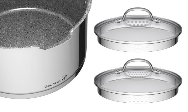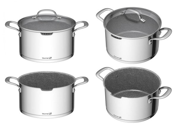 Celonerezová sada riadu G21 Gourmet Miracle je zo špeciálnej potravinárskej ocele 18/10 CrNis s vnútorným nepriľnavým povrchom GREBLON® C3+ s vysokou tvrdosťou a odolnosťou. Všetky hrnce aj panvice majú silné sendvičové dná na dokonale rovnomerné rozvádzanie tepla a sú vhodné pre každý typ ohrevu. Vďaka svojim jedinečným vlastnostiam a dokonalému prevedeniu je greblonový riad v nadčasovom dizajne veľmi obľúbený a vydrží dlhé roky.