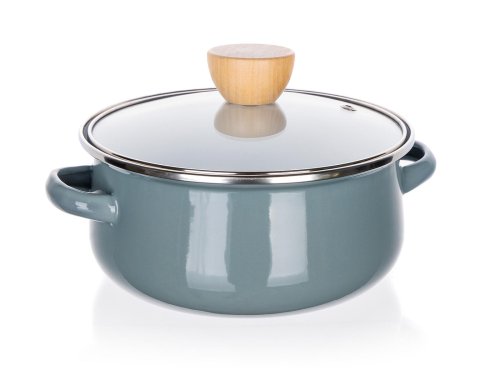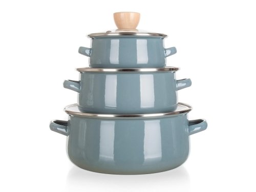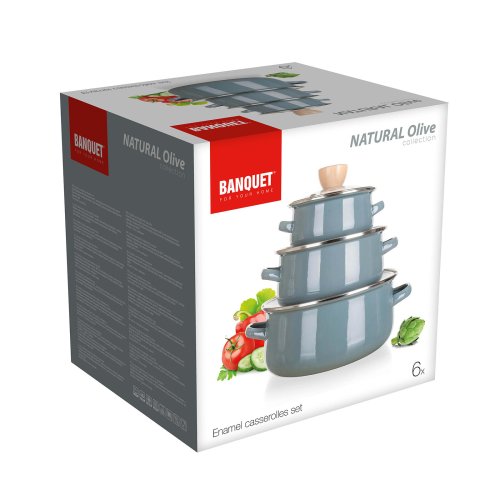 Sada smaltovaných hrncov NATURAL OLIVE, so sklenenými pokrievkami. Sú vhodné na varenie rôznych pokrmov. Hrniec môžete použiť do rúry, bez sklenenej pokrievky, ktorá je opatrená dreveným knobom. Hnrce majú 2vrstvový smaltovaný nástrek SOLID, farba v prírodnom odtieni olivy.