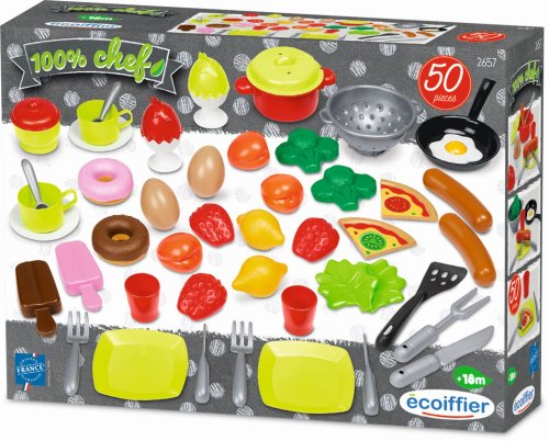 Rozsiahla sada obsahuje riad a príbory pre dve osoby, rôzne hrnce v rôznych veľkostiach, kuchynské náčinie, misky na vajcia a množstvo makiet jedla. S dobrým úchopom a bez ostrých hrán je tento doplnok pre hracie kuchynky vhodný už pre deti od 18 mesiacov. Vyrobené vo Francúzsku.