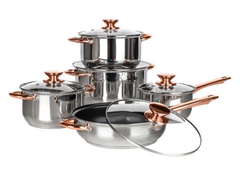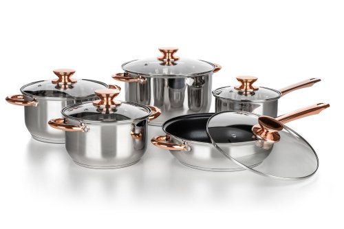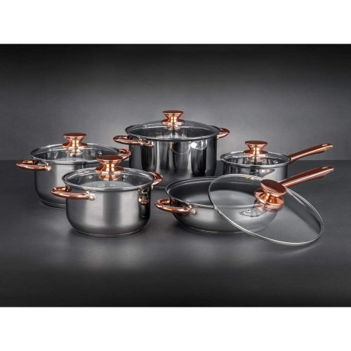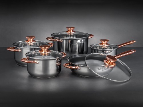 Pokrievky sú vyrobené z odolného skla a majú otvor na paru pre dokonalú kontrolu nad varením. Povrchová úprava nerezu lesk (vnútri aj zvonku). Knoby a držadlá sú s farebnou úpravou v medenej farbe. Riad sa ľahko udržuje, možno umývať v umývačke. Držadlá sú k hrncom naskrutkované.