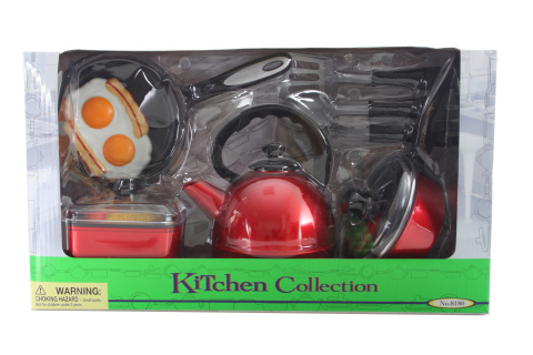 Sada kuchynského riadu s doplnkami. Obsahuje kanvicu, panvicu, rajnicu, kastról, obracačky a jedlo. Rozmery balenia cca 38 x 12 x 21,5 cm. Materiál: plast. Obsahuje celkom 13 dielikov. Vek 3+
