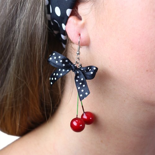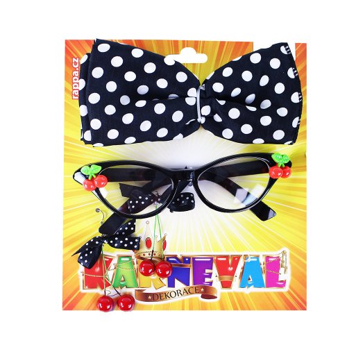 Sada čerešňová obsahuje čierne okuliare, ktoré sú zdobené malými čerešničkami, čerešňové náušnice s bodkovanou čiernou stužkou a bodkovaný šatku. Parádne doplnky na párty!
