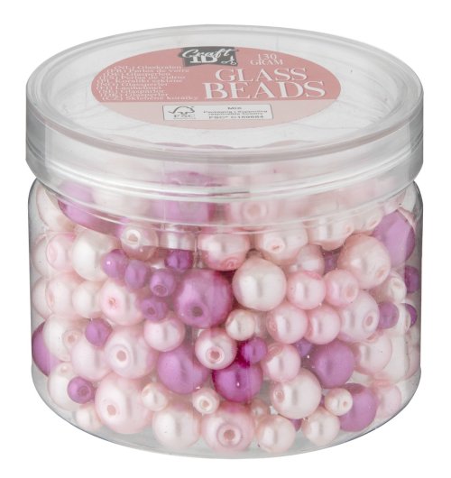 Sklenené korálky balené v praktickej priehľadnej pevnej plastovej krabičke s viečkom, celkom 130 gramov korálok rôznych veľkostí v 4 odtieňoch ružovej farby