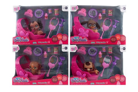 Krásna veselá sada so zvieratkom a postieľkou. Balenie ďalej obsahuje menšie doplnky - stetoskop, injekciu, hrebienok, misku, plechovku s jedlom a 2 fľaštičky s medicínou. Materiál plast. Veľkosť zvieratka cca 6 cm. Rozmery balenia cca 20x15x10 cm. Vek 3+