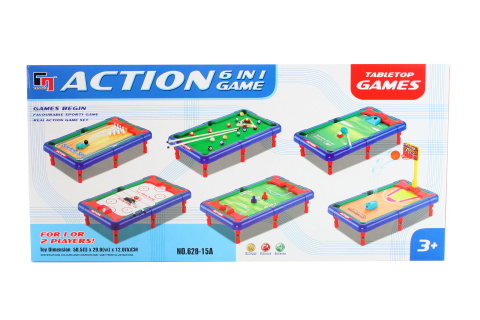 Veľká sada športových hier v jednom balení. Na jednom stolíku je možné hrať až 6 hier (bowling, basketbal, ľadový hokej, biliard, golf a futbal). Rozmer hracieho stola 50 x 29 x 12 cm. Rozmery balenia cca 62 x 30 x 5 cm. Vek 3+