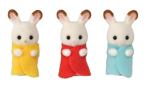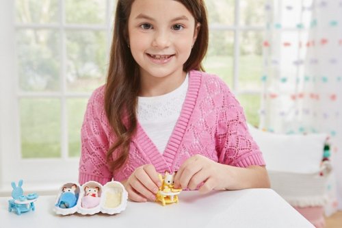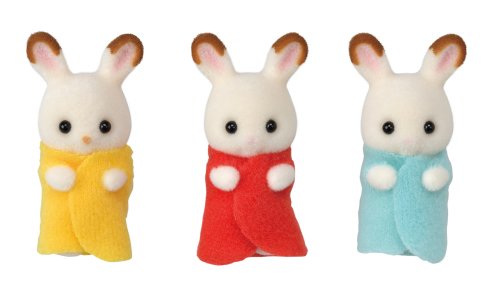 Sada malých roztomilých Chocolate zajačikov. Trojčiatka Flora, Fauna a Philip Chocolate sú najnovšími prírastkami v rodine Chocolate králikov. Bábätká môžete položiť do kolísky a prikryť dekou alebo posadiť do detských jedálenských stoličiek a nakŕmiť ich. Trojčiatka majú milujúcich rodičov, starých rodičov, bratov a sestry, ktorí sa o nich starajú a hrajú s nimi (figúrky nie sú súčasťou balenia). Figúrky sú vyrobené z plastu, ktorý je potiahnutý jemnučkým zamatom. Očičky sú z čiernych korálikov. Všetky končatiny sú pohyblivé a hlavička otáčacia. Oblečenie je vyrobené tak, aby sa dalo opakovane vyzliekať a obliekať. Užite si viac zábavy s ďalšími figúrkami a doplnkami Sylvanian Families (predáva sa samostatne). Herné sady a figúrky Sylvanian Families sú nadčasové a vysoko kvalitné hračky. Hra podnecuje predstavivosť dieťaťa. Sada obsahuje: 3x figúrka bábätiek, 3x oblečenie, 3x jedálenská stolička, 3x tanier, 3x hrnček, 3x lyžička, 3x deka, 3x kolíska. Vek: 3+. Video: https://www.youtube.com/watch?v=_2L_IHM_tPE