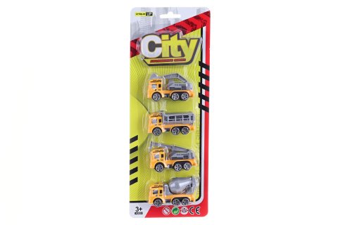 Súprava stavebných áut. Materiál plast. Balené na karte. Rozmery balenia cca 13x34x3,5 cm. Veľkosť auta cca 8 cm. Vek 3+