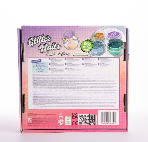 Súprava trblietavé nechty Love and Hugs – nalakujte nechty bezfarebným lakom a použite trblietky. Balenie obsahuje 4 tégliky s ekologickými trblietkami, bezfarebný lak na nechty, prstienok, šejker a praktický stojan na mobilný telefón.