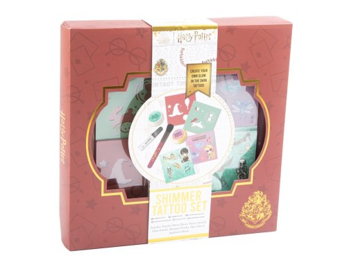 Sada trblietavého tetovania Harry Potter – vytvorte si svoje tetovanie svietiace v tme. Sada obsahuje - šablóny na tetovanie, svietiaci prášok, trblietavý prášok, kartičky s tetovačkami, telové lepidlo a štetec.